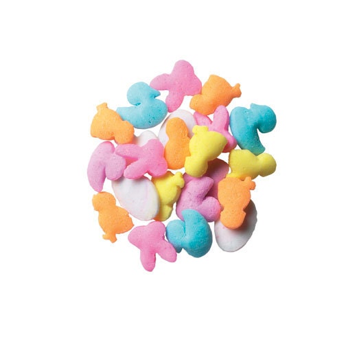 These are pastel colored eggs, chicks, ducks & bunnies approximately 1/4″ wide. There is pink, white, yellow, turquoise, orange & purple in this mix.