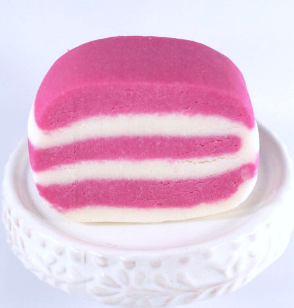 Cherry Blossom is an aromatic bubbly bath bar in a gorgeous pink & white striped design scented in the feminine, exotic fragrance of cherry blossoms.