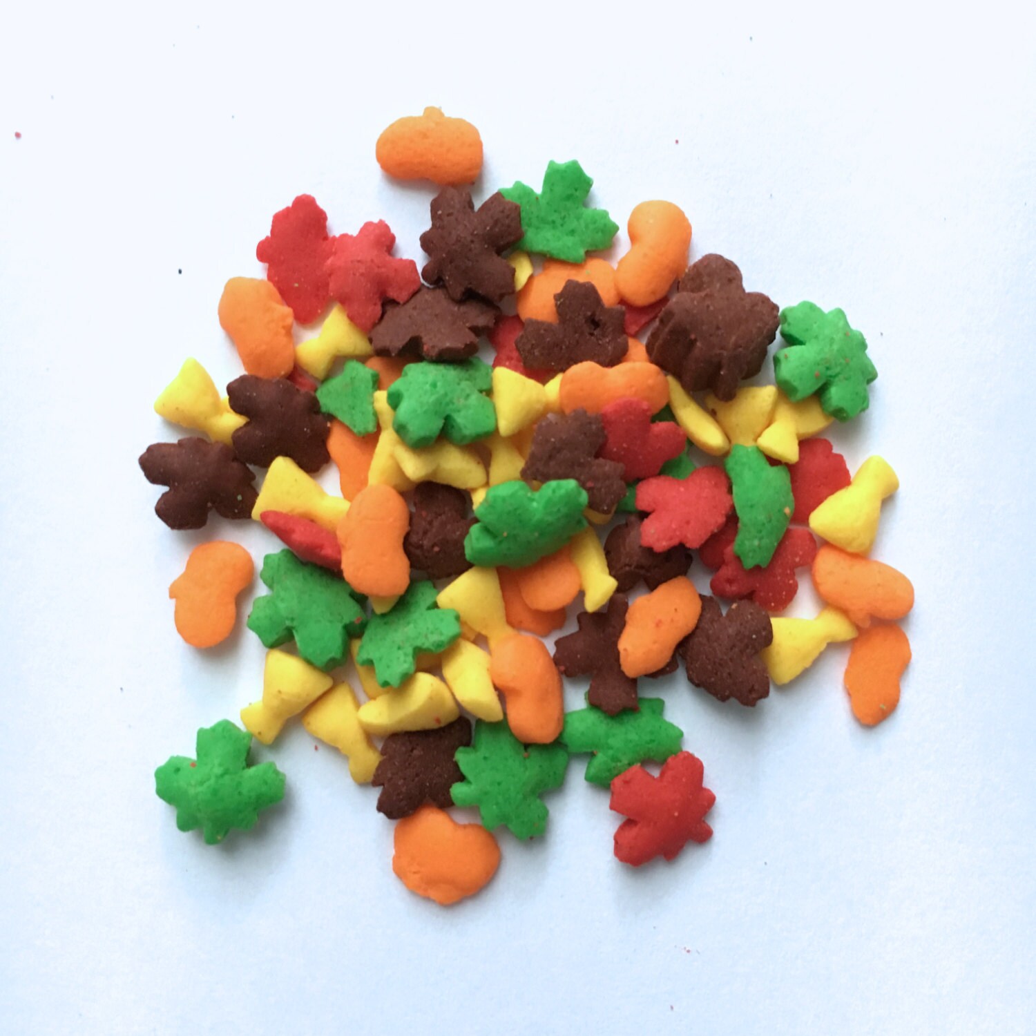 These are an assortment of autumn leaves, pumpkins and shocks of wheat in a mix of autumn colors. They are approximately 1/4″ wide.