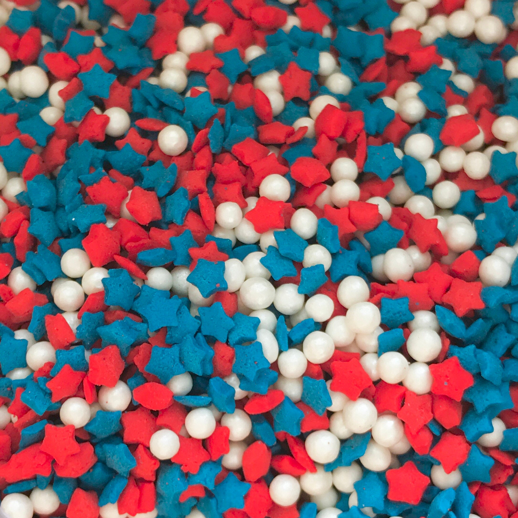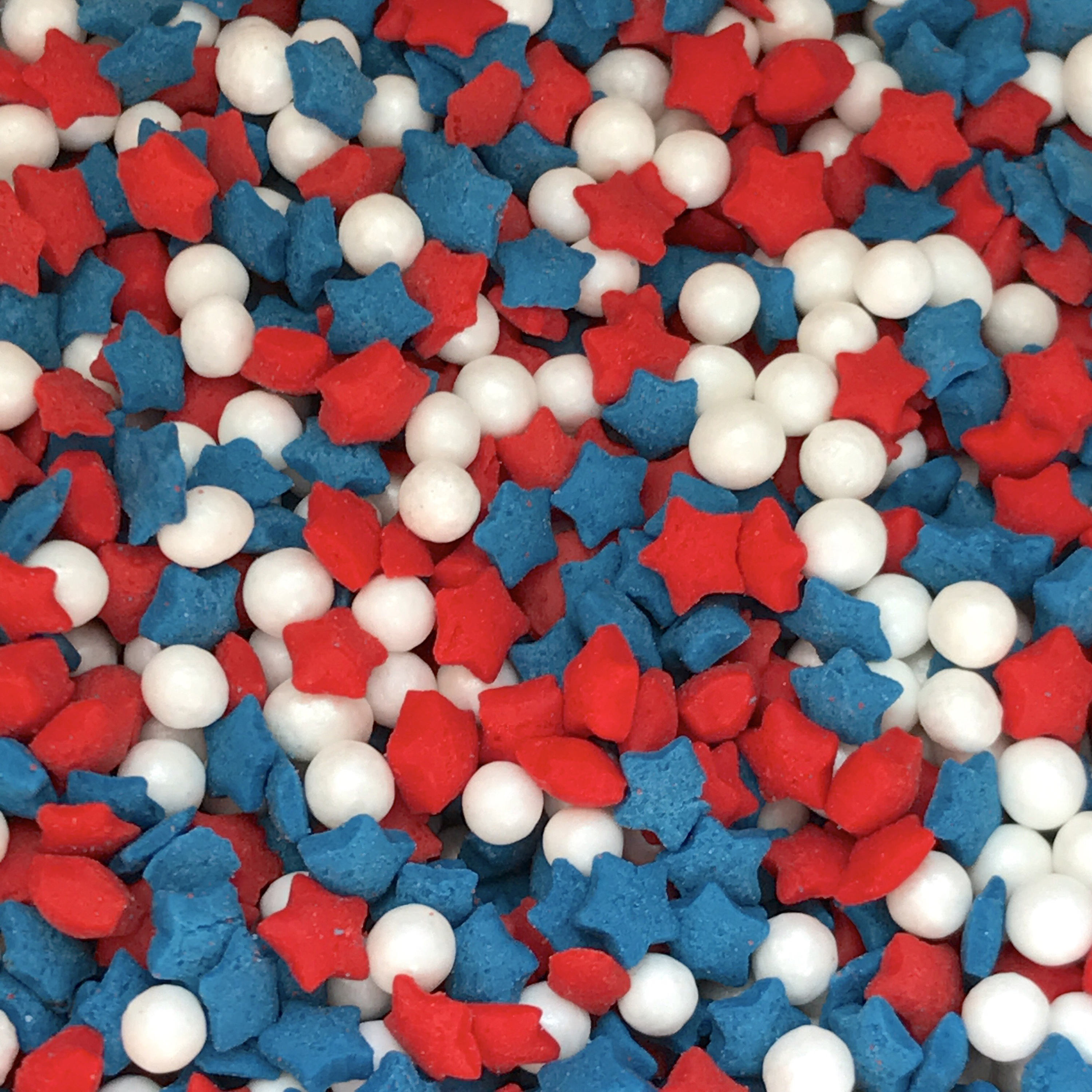 FIREWORKS are red & blue mini stars, approximately 1/8" wide mixed with tiny, white pearls. I use these as decor on bath bombs, soaps & the tops of bubblebars for that adorable final touch.